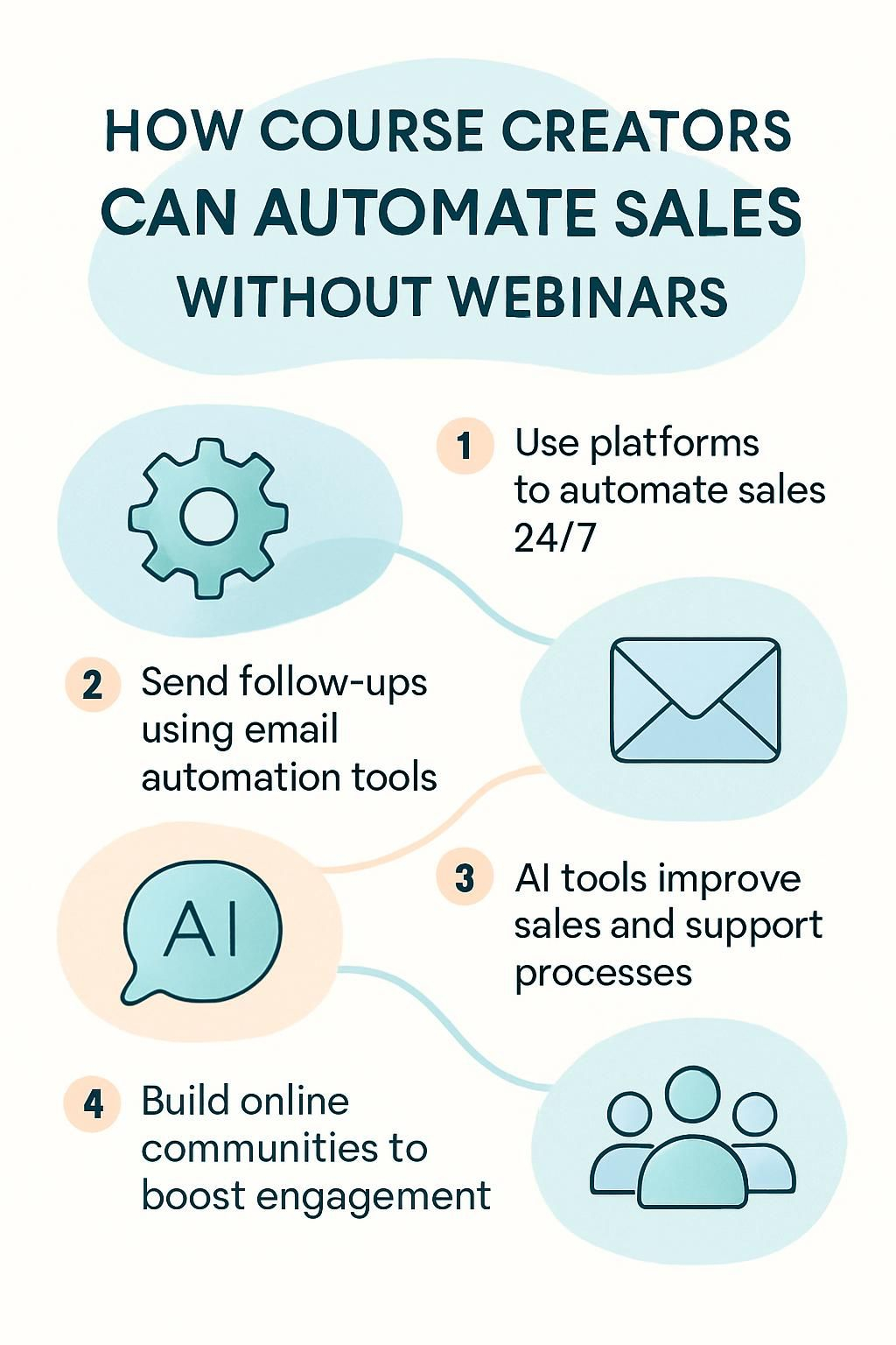 You can automate your sales without relying on webinars. Start by building automated sales funnels with platforms like Kajabi or Teachable. Use email automation to keep in touch with your leads and encourage them to buy.