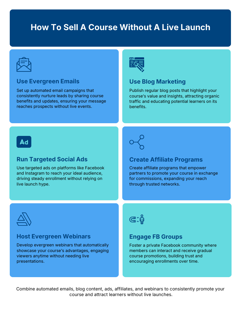 Selling a course without a live launch is possible and effective. Use the evergreen sales model to reach your audience anytime. Build a strong sales page, create valuable content, and grow your email list.