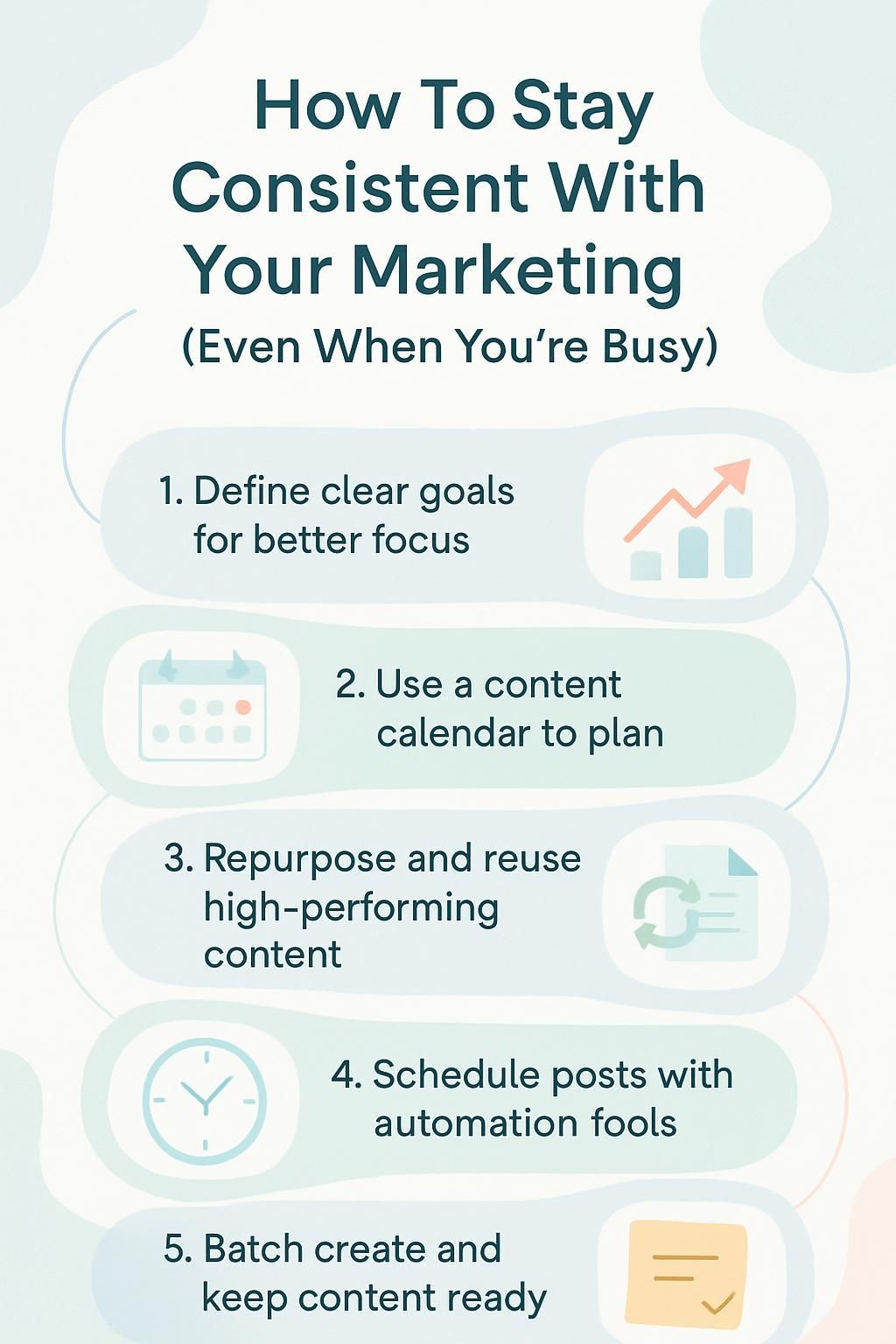 Staying consistent with your marketing is key, even on busy days. Focus on what matters most for your brand. Use tools to help you plan and schedule posts ahead of time. Repurpose what you already have to save effort.